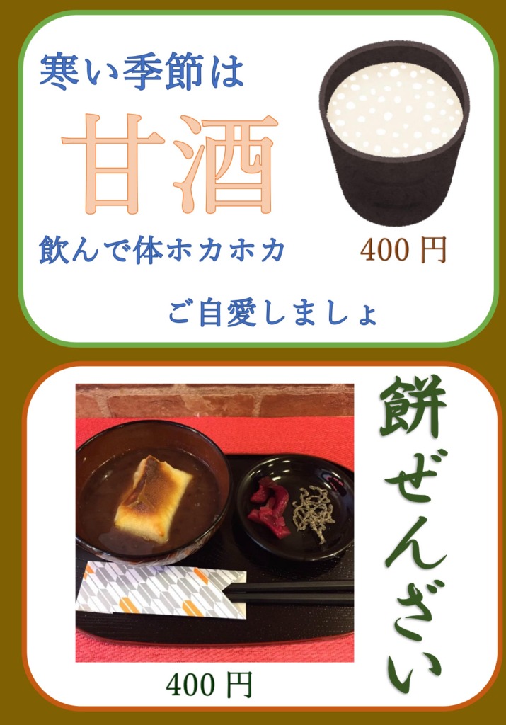 暖かい店内で、心も体も解かせる、ぜんざいとあまざけはいかがでしょうか。
